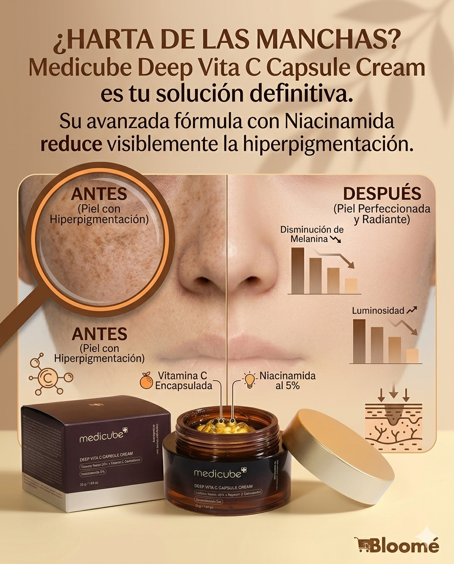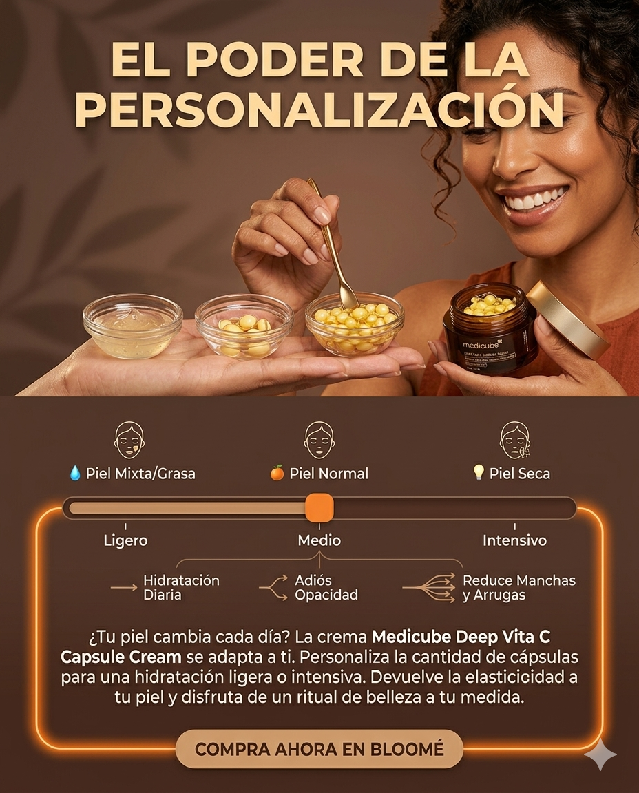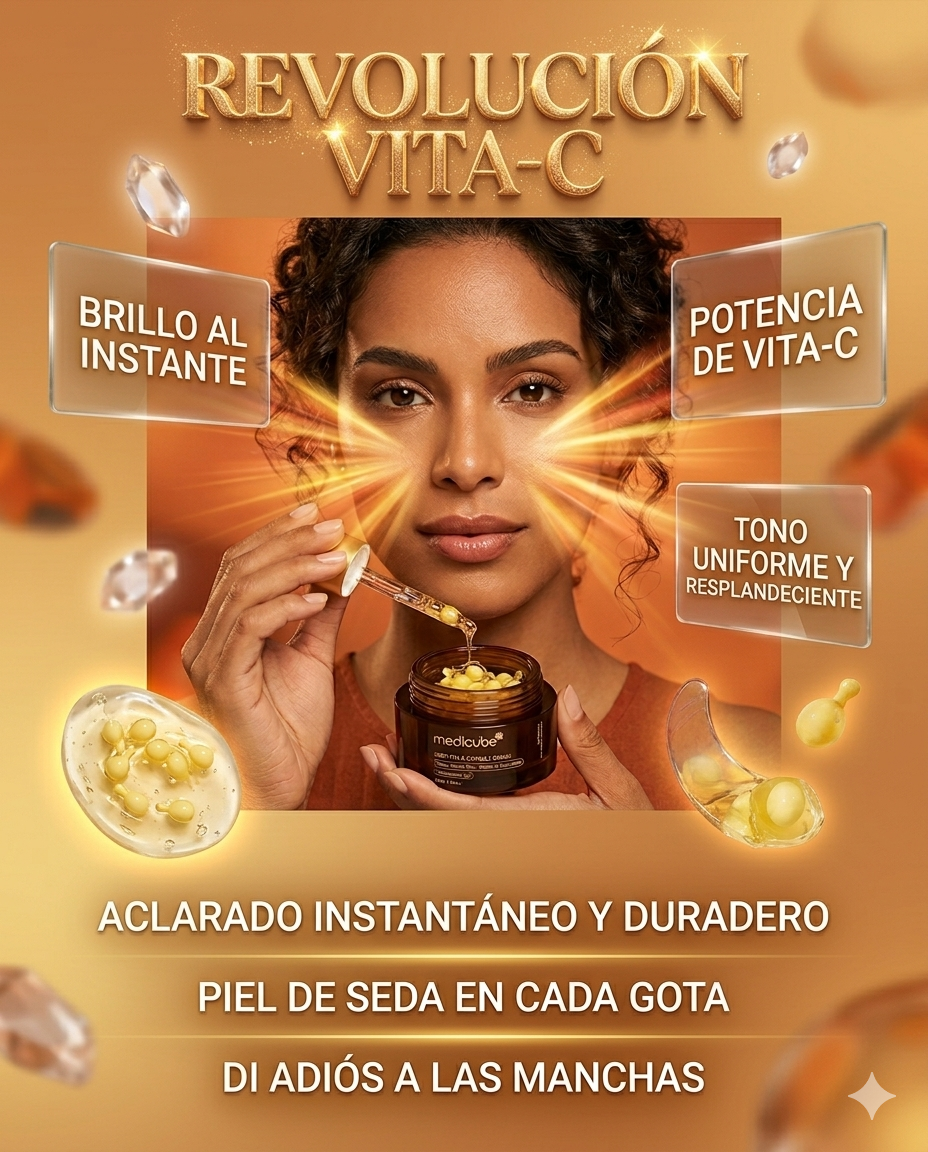 Es una innovadora crema de doble textura que combina un gel hidratante con cápsulas de Vitamina C pura. 🍊 Diseñada para personalizarse según tu piel, su fórmula con niacinamida ilumina instantáneamente 💡, reduce manchas 🚫 y devuelve la elasticidad, logrando un tono uniforme y un resplandor saludable ✨ desde la primera aplicación.